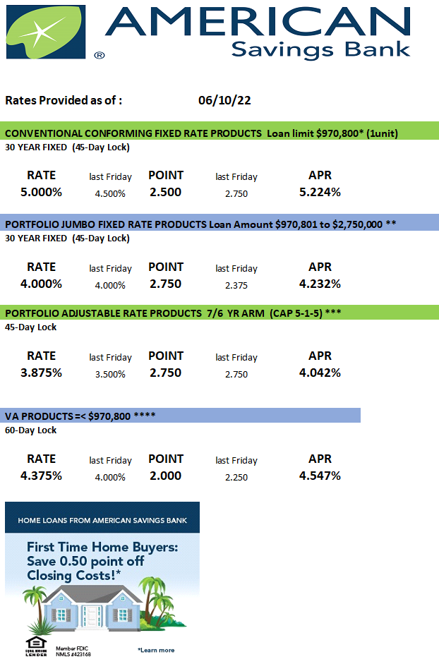 Below rates are based on Friday June 10th, please check out our today’s mortgage rates at https://www.asbhawaii.com/personal/mortgage-rates (Rate will be updated around noon every day)